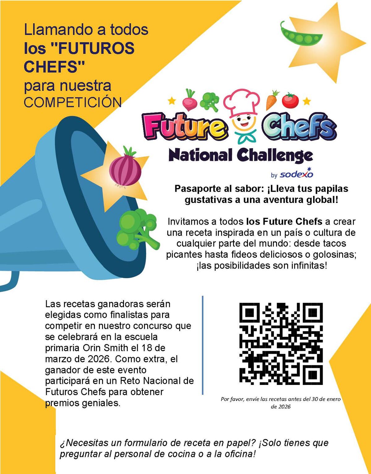 Calling all future chefs! Sodexo wants your recipes. If your student would like to enter for a chance to be part of the Future Chef competition at Orin Smith Elementary, please read the instructions below in either English or Spanish and turn in your entries in by Jan. 30. Entry into this competition is free and open to all Orin Smith Elementary students.
